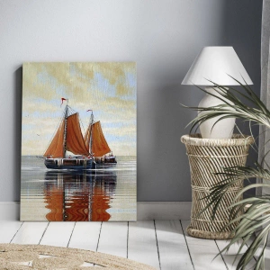 Denna canvastavla på 70x50 cm, med titeln "Hej, segel, sjöman…", avbildar tvåmastade segelbåtar som lugnt driver på vattnet. Deras reflektion i vattnet och de fina färgerna skapar ett harmoniskt och avkopplande landskap som fungerar perfekt som väggdekoration i olika utrymmen.
