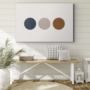 - Denna canvastavla på 70x50 cm har en minimalistisk komposition med tre färgglada cirklar i nyanser av blått, beige och orange. En subtil, modern dekoration.