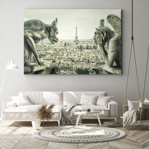 - Denna konstnärliga målning avbildar historiska gargoyler mot Paris stadssilhuett, med utsikt över Eiffeltornet. Det är den perfekta dekorationen för arkitektur- och historieentusiaster, och passar både moderna och klassiska interiörer.