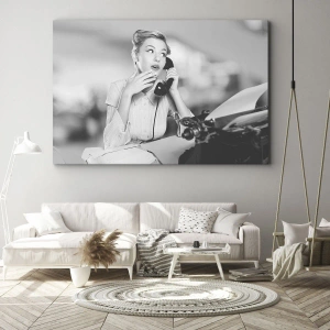 - Denna svartvita målning föreställer en kvinna som pratar i telefon medan hon sitter vid en skrivmaskin. Dess vintagestil fångar atmosfären från svunna tider, perfekt för att inreda ett kontor eller en elegant inredning.
