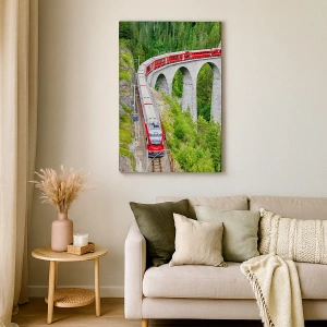 - En pittoresk målning som föreställer ett tåg som färdas längs en viadukt i ett bergslandskap. Dess naturliga harmoni och elegans passar perfekt in i moderna interiörer.