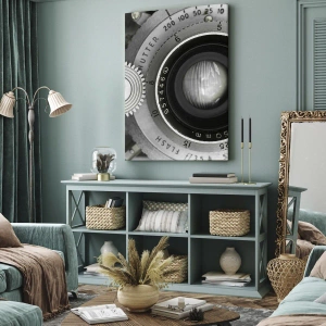 Canvastavlan "En berättelse om Hollywood" är en hyllning till klassisk fotografi och dess tidlösa charm. Den avbildar en närbild av linsen på en gammal kamera, vilket framhäver detaljerna och mekaniken hos denna unika enhet. Bildens monokromatiska ton ger elegans och betonar dess retrokaraktär.