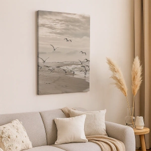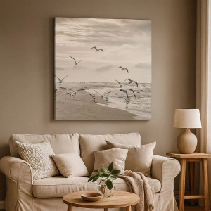 De delikata nyanserna av sand, vatten och himmel skapar en komposition full av balans och subtilitet. **Måsarnas** vingars rörelser och vågornas dynamik ger målningen en lätthet och naturlighet. Detta verk fångar skönheten i ett ögonblick vid kusten och inspirerar till drömmar och lugn.