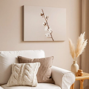 Canvastavla - Bild på duk - En kvist bomull på en beige bakgrund - 70x50cm - Hos mjukhetens källa - Modern väggdekoration för vardagsrum och sovrum ARTTOR