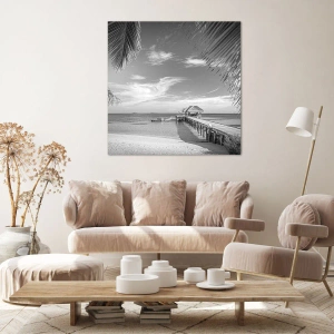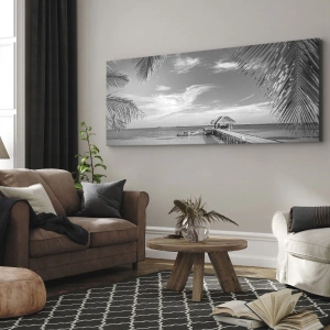 Canvastavla - Bild på duk - Svartvit strand med pir och palmer på en tropisk kust - 70x50cm - Minne eller dröm? - Modern väggdekoration för vardagsrum och sovrum ARTTOR