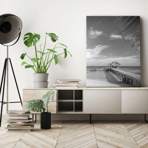 "Minne eller dröm?" är en unik canvastavla på 70x50 cm som visar en pittoresk tropisk utsikt över stranden med pir och palmer i monokroma toner. Verkets svartvita karaktär ger det elegans och tidlös charm, vilket gör det lämpligt för en mängd olika inredningsstilar.