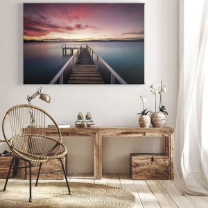 - Denna charmiga canvastavla på 70x50 cm visar en brygga som leder till en lugn sjö i solnedgången. Perfekt för inomhusmiljöer, den skapar harmoni och lugn.
