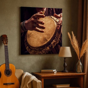- Denna målning föreställer händer som spelar på en traditionell djembetrumma. Denna dynamiska komposition utstrålar harmoni och inspiration, perfekt för moderna och konstnärliga interiörer.