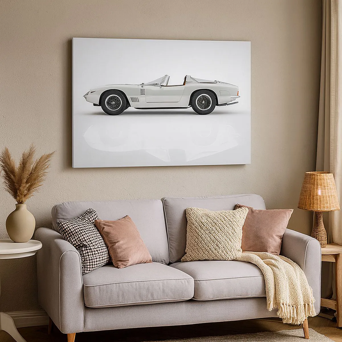 - Denna målning föreställer en klassisk vit cabriolet mot en ljus bakgrund. Perfekt för retro- och minimalistiska inredningar, den tillför elegans och sofistikering.