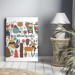 "Sagojul i skogen" är en canvastavla på 70x50 cm som visar en samling vinterskogsdjur i en färgglad och vänlig grafisk stil. Detta motiv gläds med en mängd olika färger och trevliga illustrationer som skapar en varm och glad atmosfär och passar perfekt in i barns inredning.