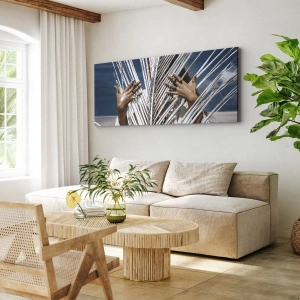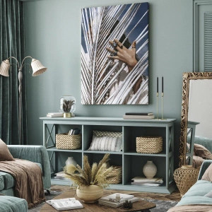 Palmlöv i kombination med en intensiv blå bakgrund ger helheten en tropisk karaktär. Ringarna på kvinnans händer betonar hennes individualitet och originella stil, vilket introducerar sofistikering och en antydan till bohemisk estetik i bilden. Detta konstverk passar perfekt för interiörer som svämmar över av inspiration och söker ovanliga dekorationer.
