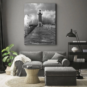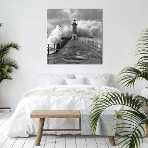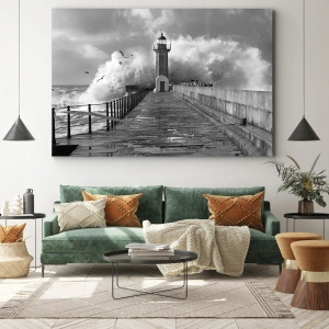 Det svartvita färgschemat betonar scenens dramatik, vilket ger bilden djup och konstnärligt uttryck. Den detaljerade återgivningen av vågorna och ytstrukturen ger realism, samtidigt som den skapar harmoni mellan naturens vildmark och fyrens lugn.