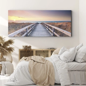 - Målningen föreställer en träbrygga som leder ner till stranden vid solnedgången. Himlens pastellfärger och landskapets harmoni skapar en unik atmosfär.