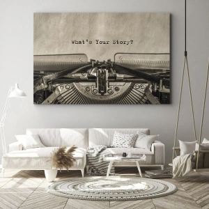 Canvastavla - Bild på duk - En skrivmaskin med orden Vad är din historia? - 70x50cm - Svara mig - Modern väggdekoration för vardagsrum och sovrum ARTTOR