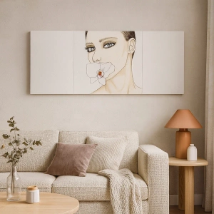 "Symbol för elegans och skönhet" är en unik målning på duk som mäter 70x50 cm, som föreställer ett porträtt av en kvinna med en orkidé i munnen. Fina linjer och subtila färger ger verket en minimalistisk men sofistikerad karaktär som passar perfekt in i eleganta inredningar.