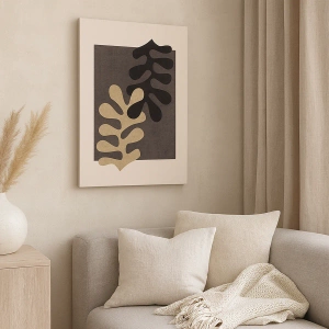 - Denna målning avbildar abstrakta löv i svart och beige mot en rektangulär bakgrund. En minimalistisk väggdekoration som introducerar en modern och elegant stil.