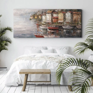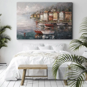Romantisk hamn är ett canvastavla på 70x50 cm som visar en pittoresk hamn vid havet med båtar mot en bakgrund av färgglada hus. Landskapet fångar den lugna atmosfären vid kusten, där vattnet reflekterar ljuset och skapar en harmonisk och rogivande utsikt. Färgglada byggnader mot ett milt landskap drar till sig uppmärksamhet och introducerar en atmosfär av avkoppling och skönhet i interiören.