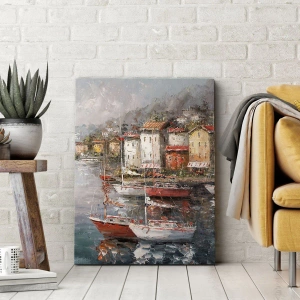- Målningen föreställer en pittoresk hamn med båtar och färgglada hus i bakgrunden, omgiven av lugnt vatten och reflekterande ljus. Perfekt som inredning i medelhavsstil, den ger harmoni och värme.