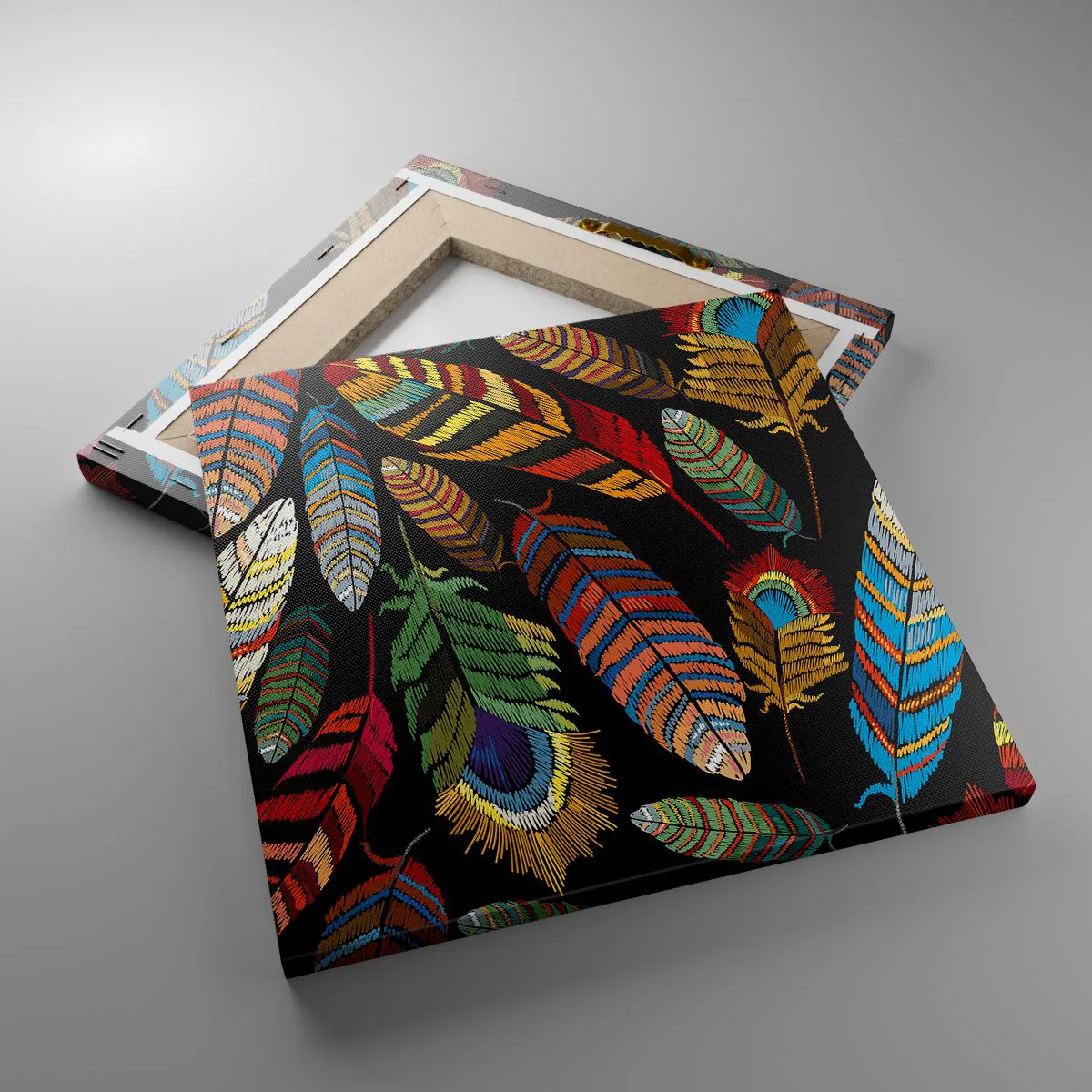 Duken är uppspänd i ramen. Sidor och kanter är täckta med tryck och skapar en fortsättning av bilden. Bilden är klar att hängas på väggen. Varje produkt har en ögla som är fastsatt i ramen samt en monteringssats (skruv + plugg).