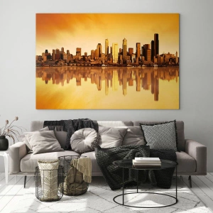Stadens arkitektur, avbildad i gyllene toner, symboliserar modernitet och stil. Skyskrapornas reflektion i vattnet ger djup och unikhet, vilket skapar en extraordinär visuell effekt. Denna bild passar perfekt in i utrymmen som vardagsrum, kontor eller sovrum, vilket ger dem elegans och sofistikering.