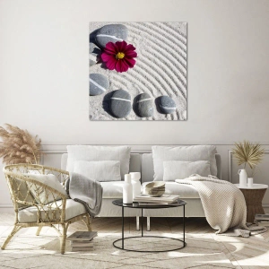 - Stenar med vita ränder arrangerade på sand i zenstil, prydda med en lila blomma. Denna glastavla på 70x50 cm är perfekt för interiörer som skapar en atmosfär av lugn och harmoni.