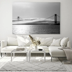 Glastavla - Bild på glas - En bro i svartvitt med dimma över vattnet - 70x50cm - Passera Golden Gate - Modern väggdekoration för vardagsrum och sovrum ARTTOR