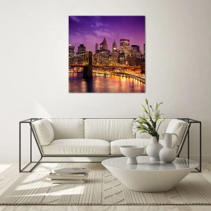 Glastavla - Bild på glas - Manhattan i violett och guld - 40x40 cm