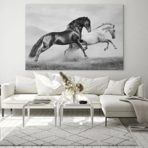 Glastavla - Bild på glas - Svartvita hästar i en dynamisk miljö - 70x50cm - Änglar och demoner - Modern väggdekoration för vardagsrum och sovrum ARTTOR
