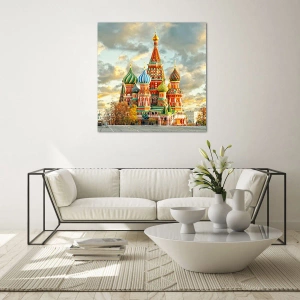Motivet med Vasilijkatedralen, som ligger på Röda torget, introducerar en atmosfär av exceptionellt arkitektoniskt hantverk i interiören. Denna dekoration kommer att se bra ut i ett vardagsrum, kontor eller sovrum och ger karaktär och klass till utrymmet.
