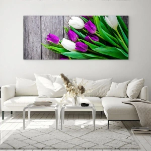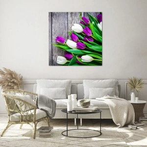 Glastavla - Bild på glas - En bukett lila och vita tulpaner på en träbakgrund - 70x50cm - På vårdagen - Modern väggdekoration för vardagsrum och sovrum ARTTOR