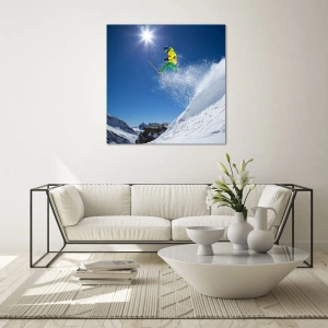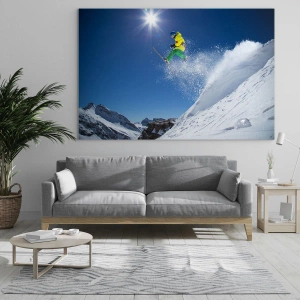 Tack vare glastrycktekniken utmärker sig målningen för sina intensiva färger och höga detaljer. Skidåkarens silhuett, snödammet som svävar i luften och solens strålar mot den blå himlen skapar en harmonisk, actionfylld komposition. Skidåkare, Berg och Action presenteras med största precision.