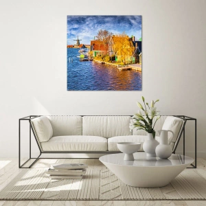 Bild på glas är tillverkad på 4mm tjockt glas. Glaskanterna har en trapetsformad matt fas. Bilden är säker i användning och klar att hängas upp - har metallöglor fastsatta på bildens baksida samt distanser av skum som säkerställer ett jämnt avstånd mellan bilden och väggen.