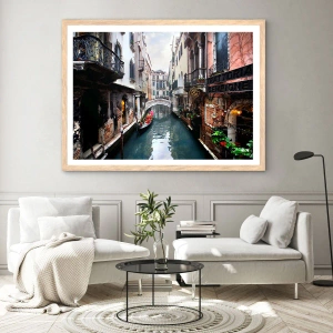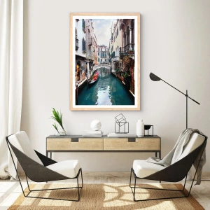 Affisch i ram av ljusek - Venedig-landskap med gondol och bro - 61x91 cm