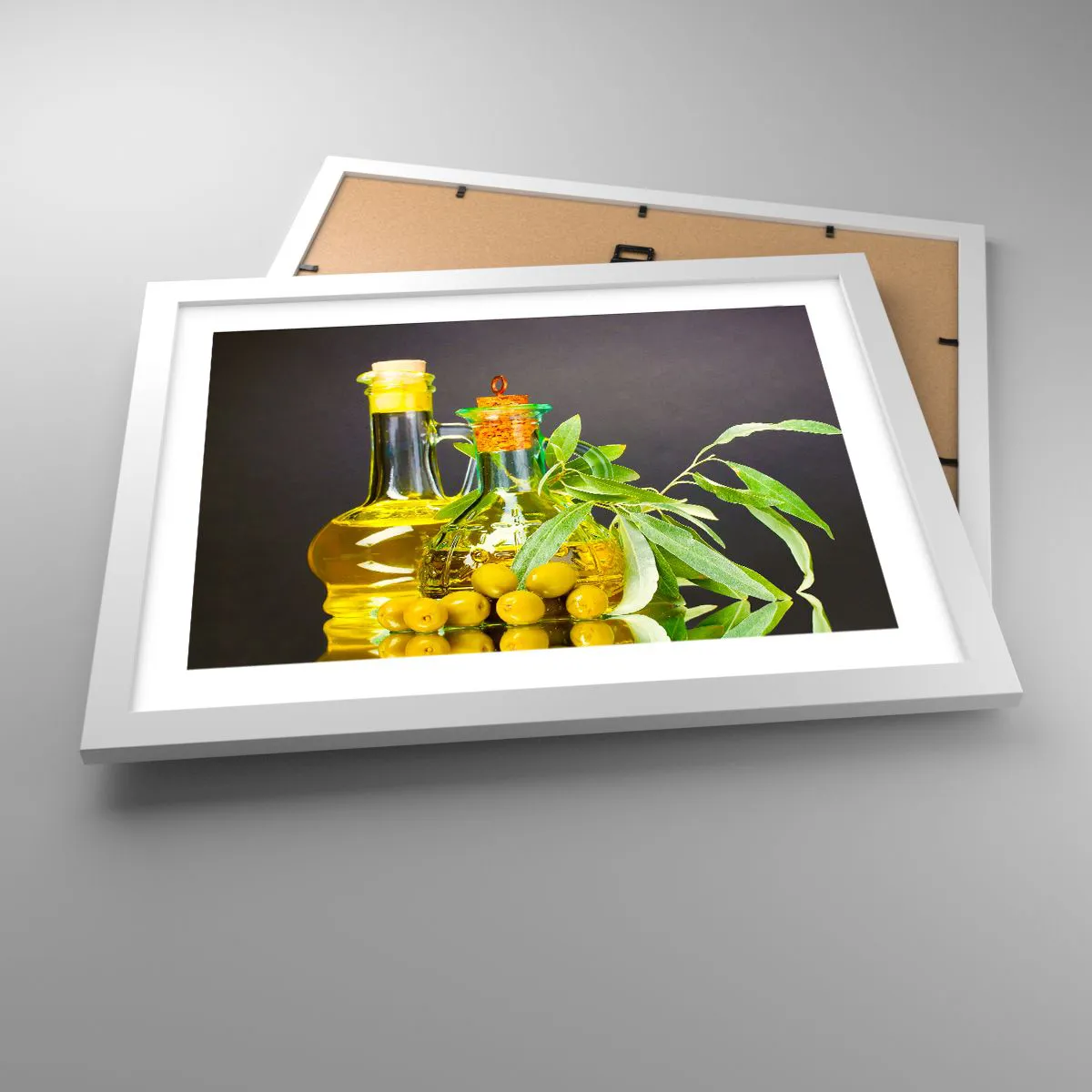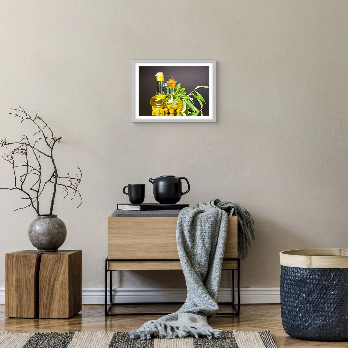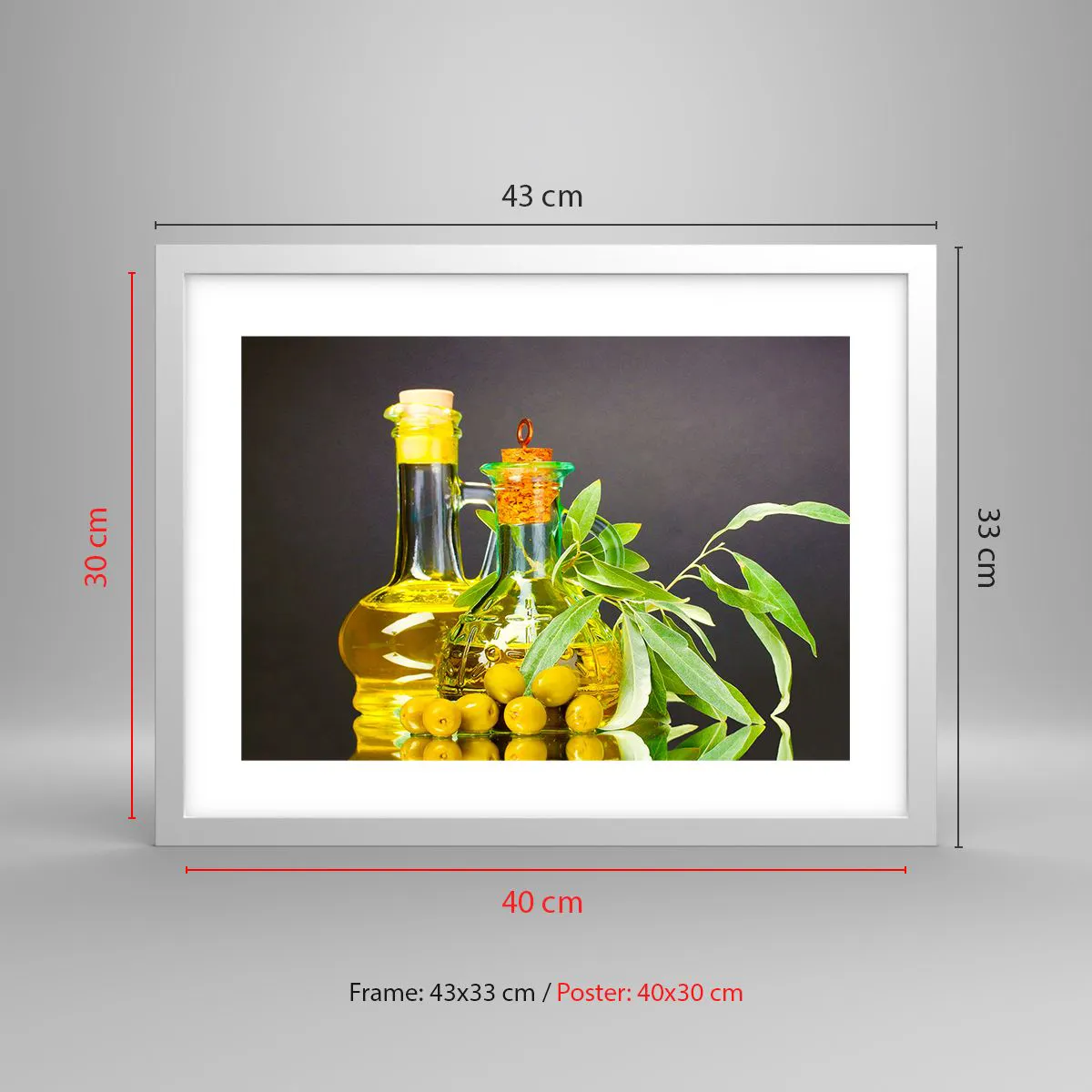 Affisch i vit ram - Stilleben med oliver och olivolja - 40x30 cm