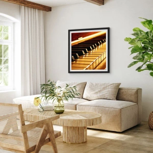 - Denna poster föreställer en närbild av pianotangenter i varmt gyllene ljus. Ett elegant motiv som framhäver musikens harmoni och den klassiska stilen i alla inredningar.