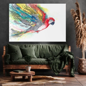 - Denna målning föreställer en vacker, färgglad papegoja i flykt, med dynamiska, abstrakta mönster på sina vingar. Det är den perfekta inredningen och skapar en tropisk atmosfär och en energisk atmosfär.