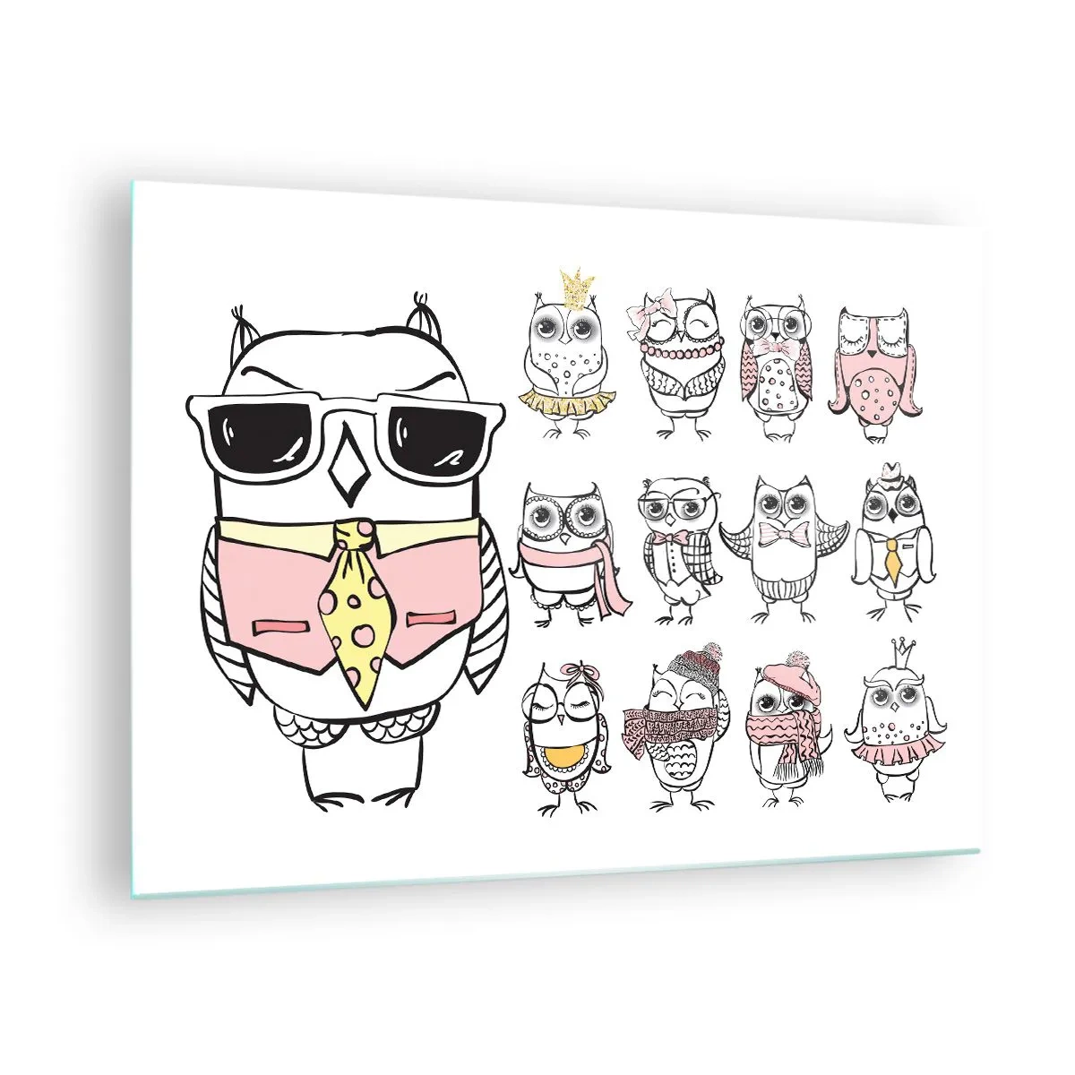 - Detta glastavla föreställer lekfulla uggleteckningar i en mängd olika stilar. Perfekt för ett barnrum eller en humoristisk inredning.