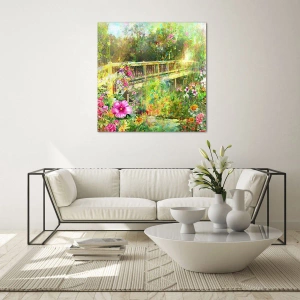 Glastavla - Bild på glas - En bro omgiven av frodig vegetation och färgglada blommor - 70x50cm - Vårsuckarnas bro - Modern väggdekoration för vardagsrum och sovrum ARTTOR