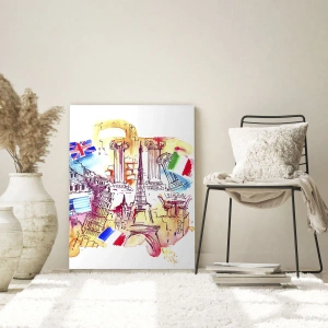 - En konstnärlig akvarell som föreställer europeiska landmärken med landsflaggor. En perfekt dekoration för dig som älskar resor och unik inredning.