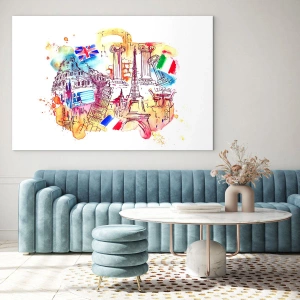 Glastavla - Bild på glas - Akvarell av europeiska monument med landsflaggor - 70x50cm - Europeisk turné - Modern väggdekoration för vardagsrum och sovrum ARTTOR