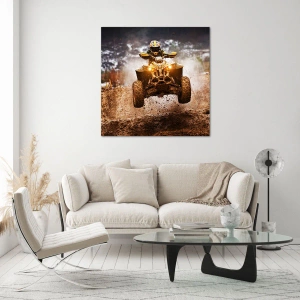 Glastavla - Bild på glas - Fyrhjuling i aktion på lerig terräng i en dynamisk miljö - 70x50cm - No risk no fun - Modern väggdekoration för vardagsrum och sovrum ARTTOR