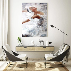 De dominerande nyanserna av vitt och grått skapar en harmonisk och sammanhängande komposition som passar perfekt in i en mängd olika inredningsstilar. Bakgrunden på målningen, dekorerad i delikata färger, betonar ballerinans silhuett, vilket ger hela verket uttrycksfullhet och djup. Målningens stil fångar rörelsens dynamik, vilket gör den till ett verkligt konstverk.