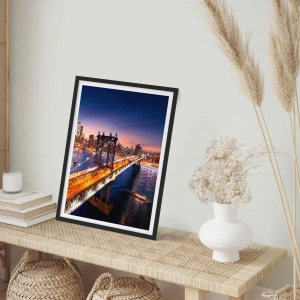 - Denna poster föreställer New York-bron på natten, med Manhattan upplyst och ljusen reflekterade i floden. Perfekt för älskare av urbant liv och modern inredning, den levereras med en svart ram på 50x70 cm.
