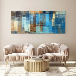 Glastavla - Bild på glas - Genom blåa gardinen - 50x70 cm