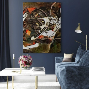 Målningens färger inkluderar varma nyanser av brunt, orange och gult, som kontrasterar mot vitt och svart, vilket ger kompositionen en dynamisk karaktär. Detaljer i målningen, såsom precisa linjer och geometriska former, väcker intresse och uppmuntrar till längre granskning. Detta är konst som inspirerar och drar till sig uppmärksamhet.
