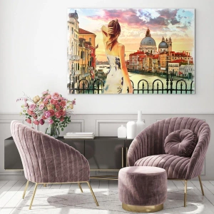 Glastavla - Bild på glas - En kvinna beundrar utsikten över Venedig i solnedgången. - 70x50cm - Äventyr endast i ... - Modern väggdekoration för vardagsrum och sovrum ARTTOR