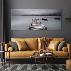 Målningen gjordes på glas i ett 70x50 cm-format, vilket betonar dess modernitet och elegans. Glastrycktekniken fångar varje detalj med extraordinär precision – från texturen på bryggans gamla träplankor till de subtila tonövergångarna mellan vattnet och dimman. Den speglade ytan ger djup och förstärker effekten av ett realistiskt landskap, vilket skapar ett tredimensionellt intryck.