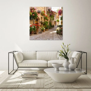 Glastavla - Bild på glas - En pittoresk gata med krukväxter - 70x50cm - I blommornas flod - Modern väggdekoration för vardagsrum och sovrum ARTTOR