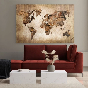 Målningen skapades med extraordinär uppmärksamhet på detaljer, tack vare vilken varje kontinent och linje är tydlig och full av texturellt djup. Träimitationseffekten ger en naturlig och mysig karaktär till helheten, vilket kommer att fungera bra i ett vardagsrum, arbetsrum, kontor eller bibliotek. Det är en dekoration som ger harmoni och lugn till interiören.