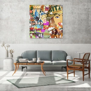- Målningen har ett kreativt retrokollage med inslag av affischer och popkonstgrafik. De livfulla färgerna och det nostalgiska motivet skapar en unik atmosfär och inspirerande stil.